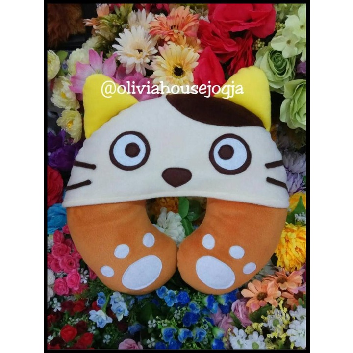 - Bantal Leher Topi Tomo Cat Warna Cokelat Cream, Telinga Kuning